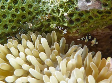 Colorful spotted cleaner shrimp live among the giant anemones. They wave you over by swinging their long white antennae to advertise a cleaning and often come swimming right out to you. These shrimp average around 1 inch in length.
