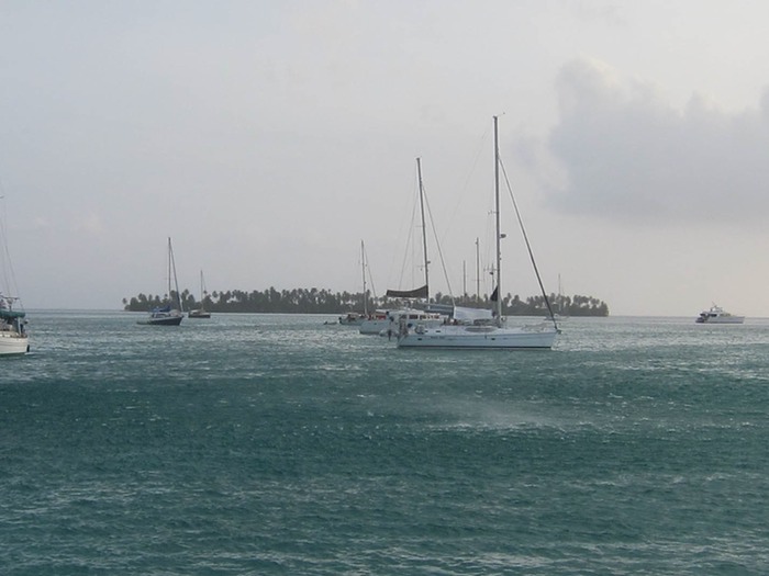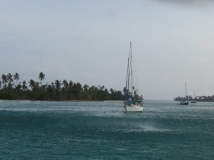 The weather is localized in the San Blas, being situated in a basin of the southern Caribbean sea in a semi-permanent low pressure region. This means that weather can be sucked into these islands from the mountains, barrel over the isthmus from the Pacific, or reach down to give us a taste of the tropical waves marching across us to the North. At least in the daytime we can usually see it coming, at times closing in from both sides. The rain, we'll take to filter into our water tank.