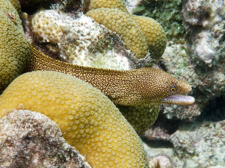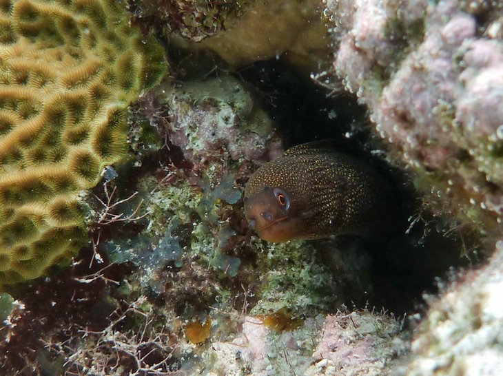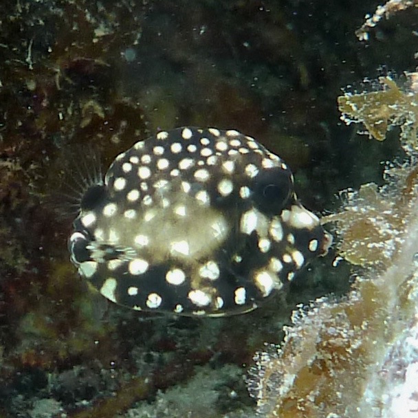I also saw a goldentail moray eel that was significantly smaller than the adults and had a nose-marking that led me to believe that it was a juvenile. Juvenile trunkfish look like a cute little round pet, with their big eyes and their tails tucked in. The littlest ones are the size of a marble.