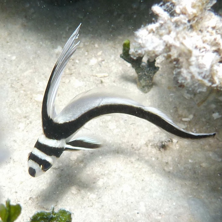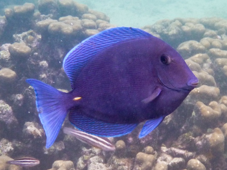 The spotted drum seems to "grow into" its dorsal fin with maturity and the juvenile blue tang contains no blue except for its iris, before turning into the deep blue of the adult version (& Nemo co-star).