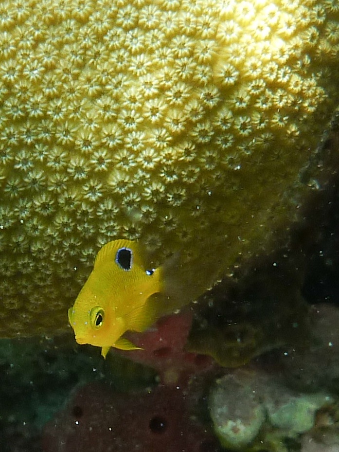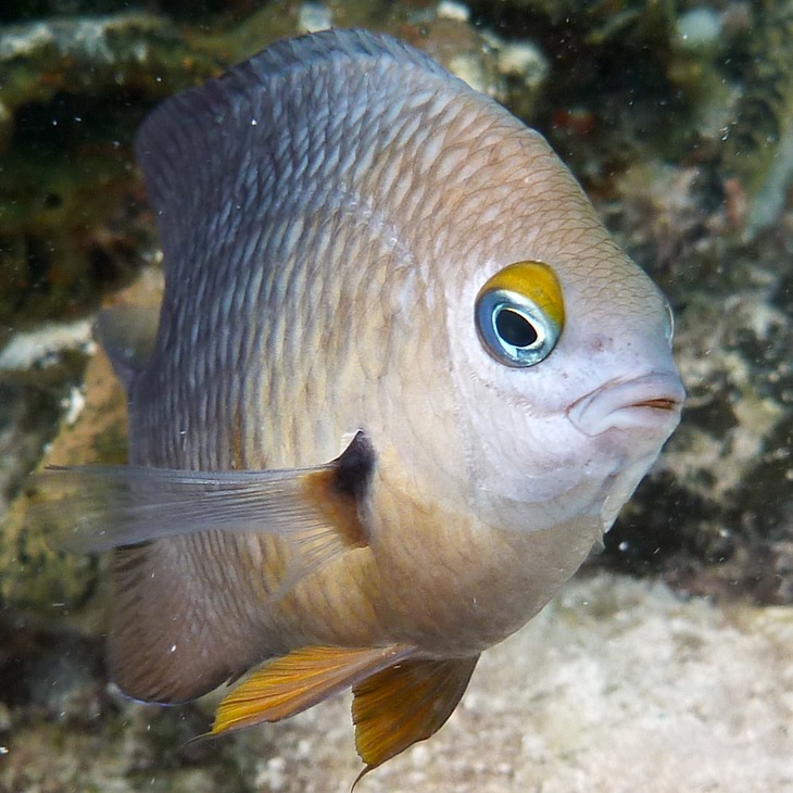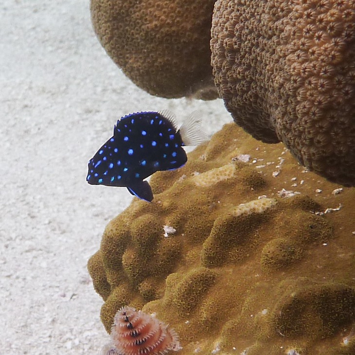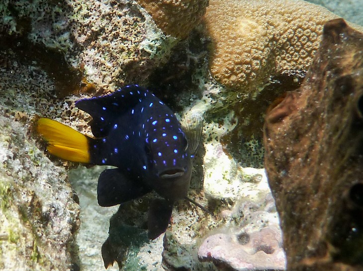 The juvenile yellowtail damselfish is also known as a jewelfish due to its sparkling blue spots. No human is too big for the aggressive threespot damselfish to chase away from his territory. Needless to say, adult damselfish are less camera-shy.