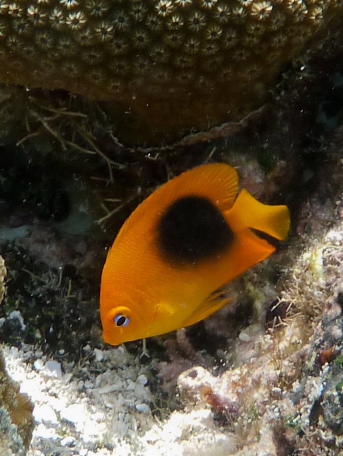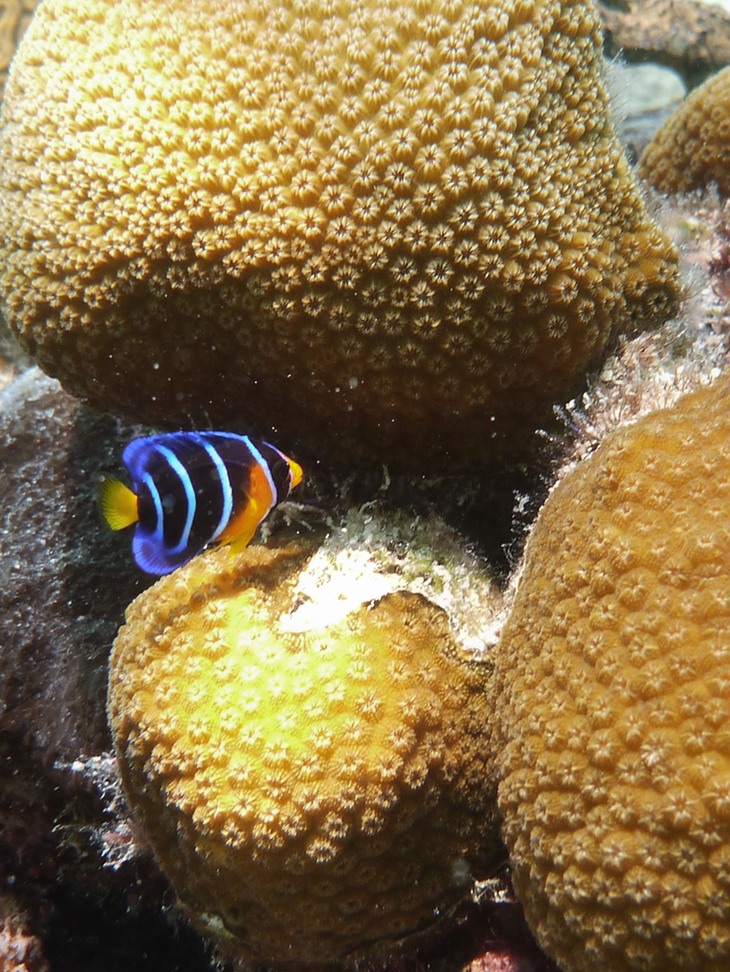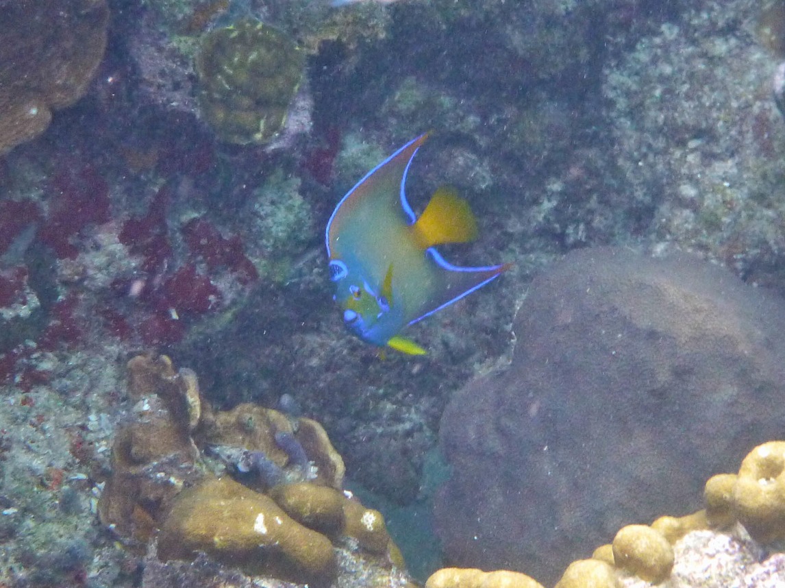 Swimming to a shallow reef just off of the boat, I see a flash out of the corner of my eye and stumble across brilliantly colored juvenile fish about 1 inch in length. Being fast and shy, these guys are are hard to get a good picture with all of their adolescent energy. The queen angelfish and rock beauty juveniles have glowing yellow/oranges and/or iridescent blues. Their elders are just as beautiful but remain quite shy.
