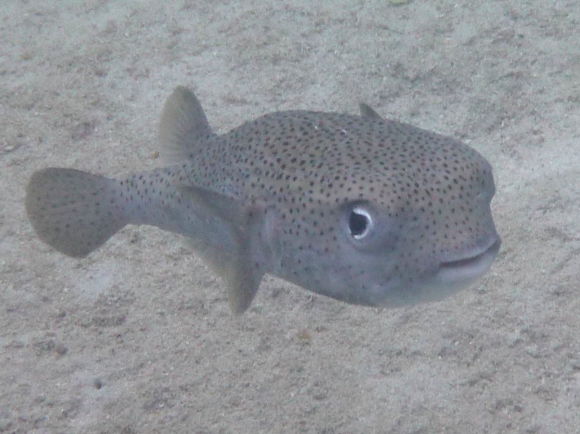 Wendy also spotted a 5" spotted drum protecting his rock from the intrusive diver (me) taking a picture; a grown-up version of the often seen juveniles with the distinctive stripe on their nose. And what's not to love about this cute porcupinefish.