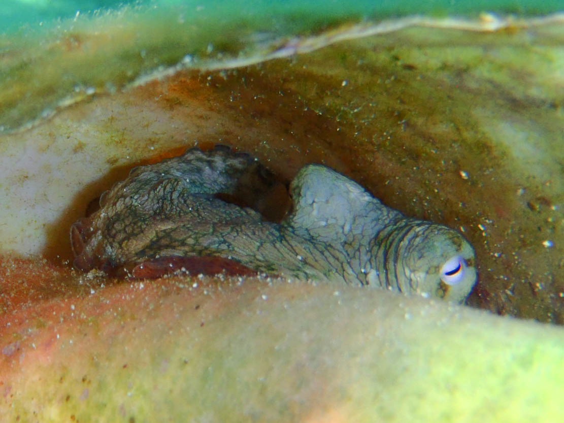A sand tilefish provided good entertainment behind Reach as it built and tended a massive burrow made of rubble and sand. Nearby, another pygmy octopus was hiding in a conch shell, not much bigger than my thumb, pretending not to notice that it was being handled as it turned different colors.