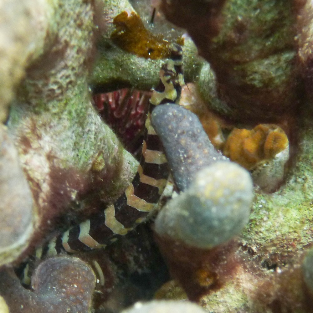 Essentially, we see [or hear] something underwater that looks interesting or moves from its camouflage, snap a few pictures and then go back to look it up in our reef series ID books. That is how we [Lizz] found this rare harlequin filefish, the sapo bacon toadfish [Alan], and the tiny pygmy octopus [Lizz] living in a conch shell! Okay at least, I found the big octopus by noticing a trail of empty shells leading to his coral hole.