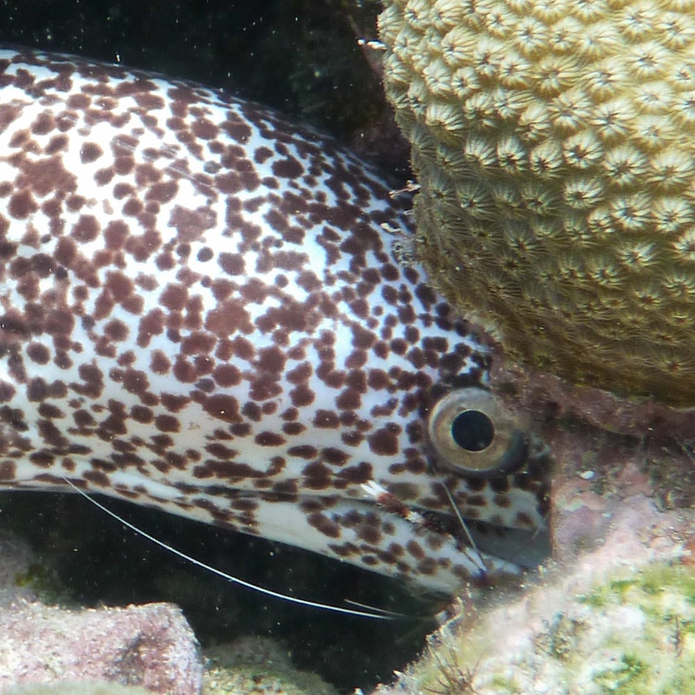 A variety of shrimp live throughout the reefs and once noticed, became my first underwater photography obsession. They come in all shapes, sizes and colors and hide in predictable homes including caves, anemones and/or soft coral. A challenge to photograph well, at least they don't swim away like fish do and may actually approach a hand holding a camera in an attempt to give it a nice cleaning.