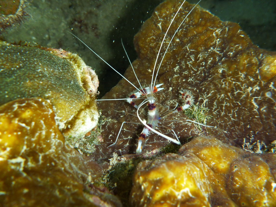 Banded coral shrimp are abundant and not shy, also getting to be quite big up to 2 inches. The telltale sign long white antennae dangling out of a cave where they hide during the days and hang out, usually upside-down.