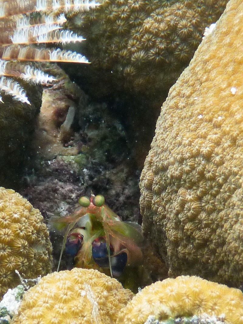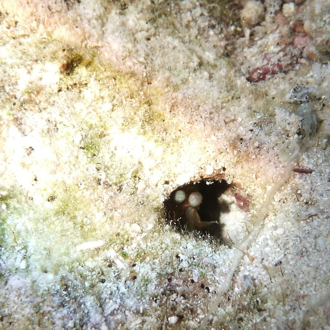 Starting with the larger shrimp in the 1-2 inch size, the mantis shrimp titter rapidly around a hole and for some reason, their speed and manner always reminds me of a cockroach. They are extremely skittish and dash into a hole to check you out, eyeballs eerily following your every move.