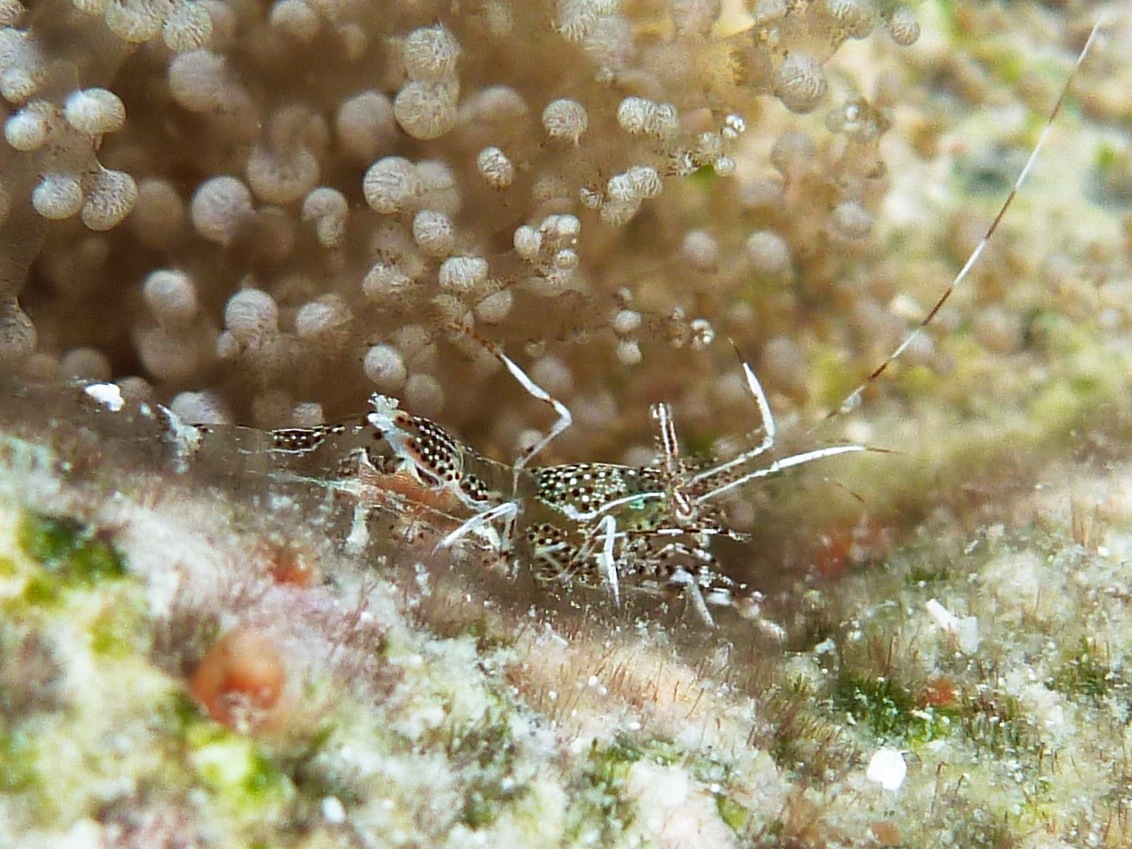 Colorful spotted cleaner shrimp live among the giant anemones. They wave you over by swinging their long white antennae to advertise a cleaning and often come swimming right out to you. These shrimp average around 1 inch in length.