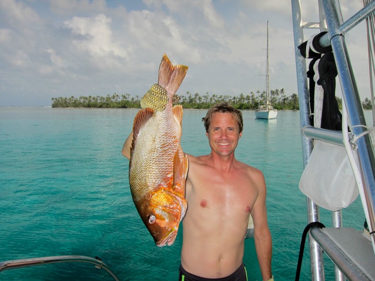 We had a wonderful dinner with Marie & JP on their custom power catamaran Domino, with their son James & Sika visiting. Along with lobster salad, this dog snapper catch-of-the-day was converted into sashimi and sushi rolls. Since we always try to experiment with ingredients, the latest discovery (thanks to James) was that fresh picked basil leaves add a clean, fresh taste to rolls. Yummm!